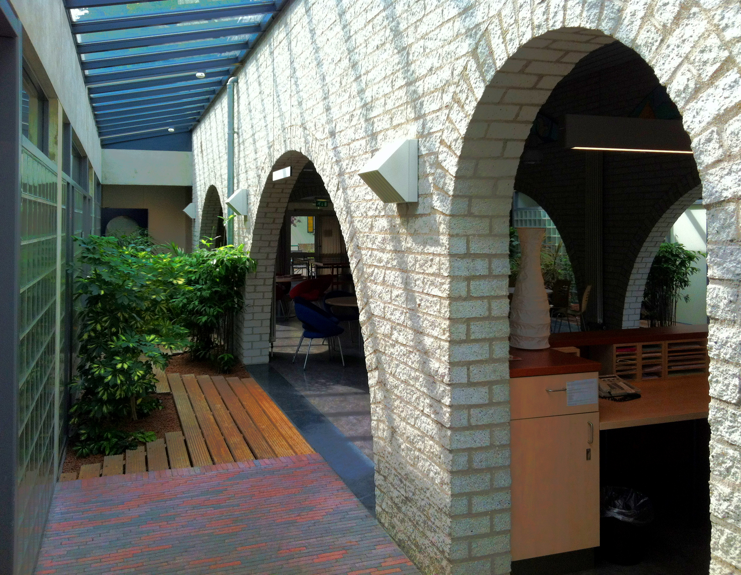 In de uitwerking van het ‘helende’ interieur – een nauwe samenwerking met Suzanne Holtz Studio – is gebruikgemaakt van natuurlijke materialen en gedempte, rustgevende kleuren. Van wanden met crèmekleurige steenstrips en realistische fotoprints tot deuren, vloeren en tafels van hout. In alle ruimten heeft het daglicht vrij spel, wat een positief effect heeft op de gezondheid. De volledig nieuwe klimaatinstallatie – naar advies van ingenieursbureau Deerns – zorgt voor een comfortabel en gezond binnenklimaat.